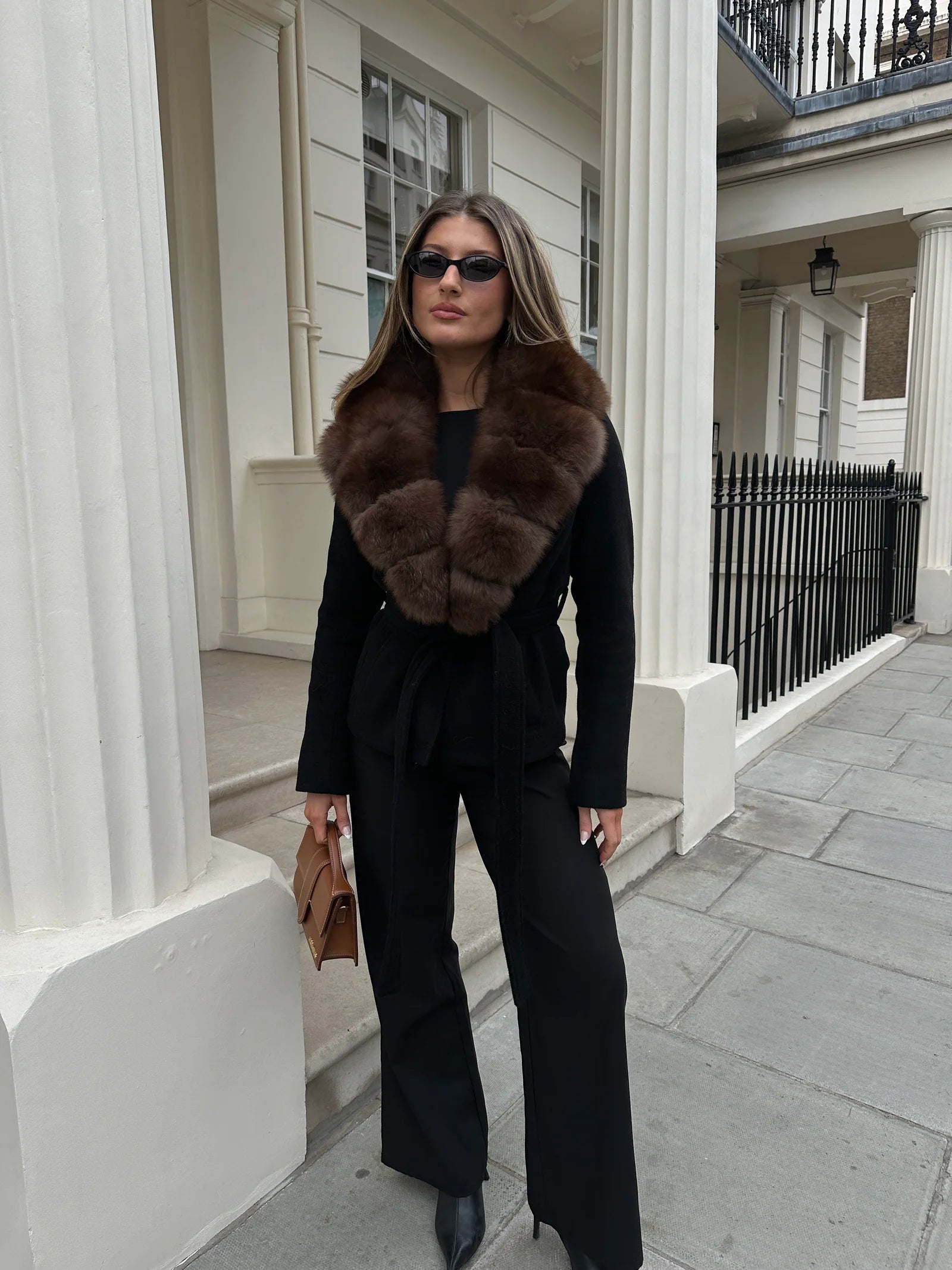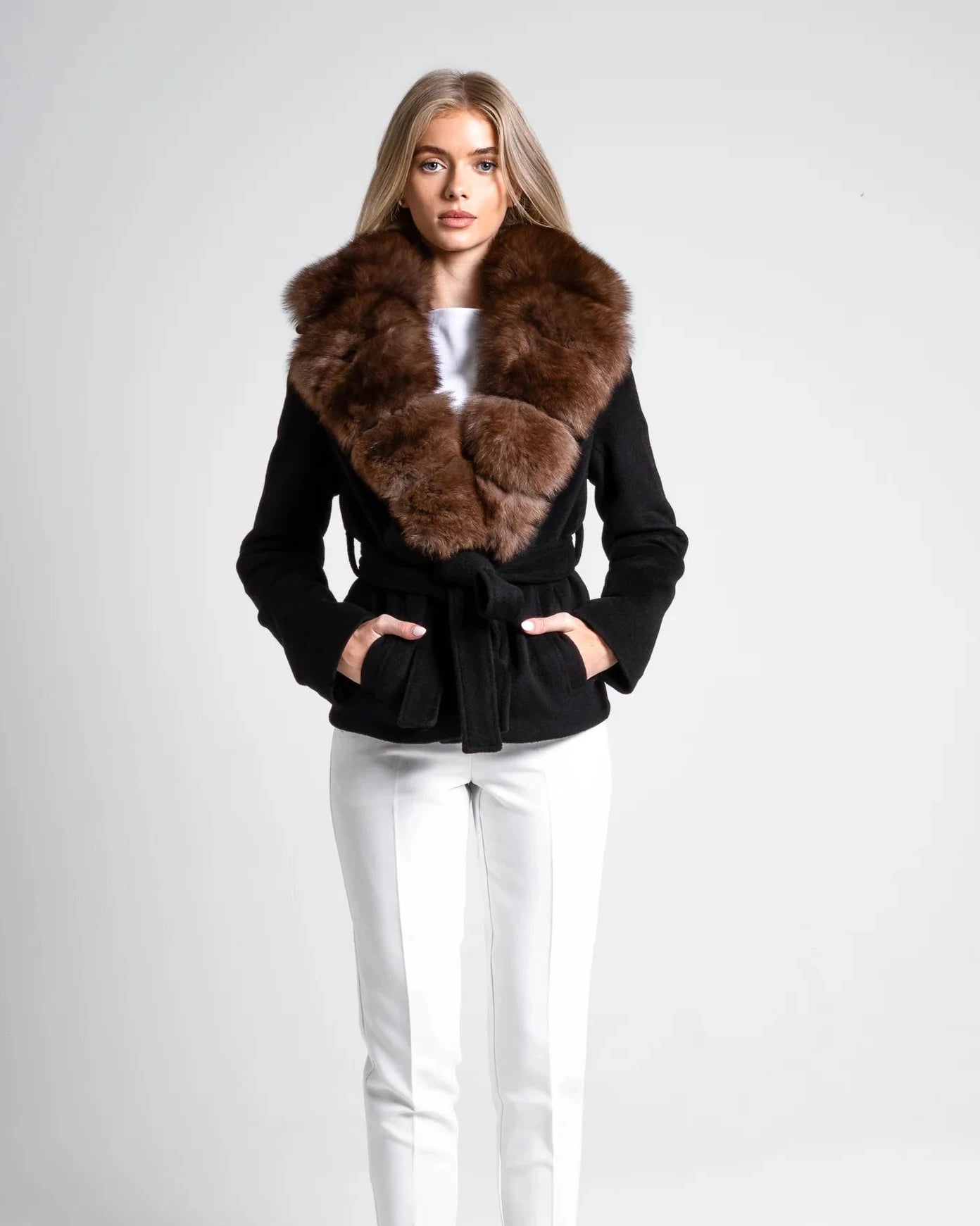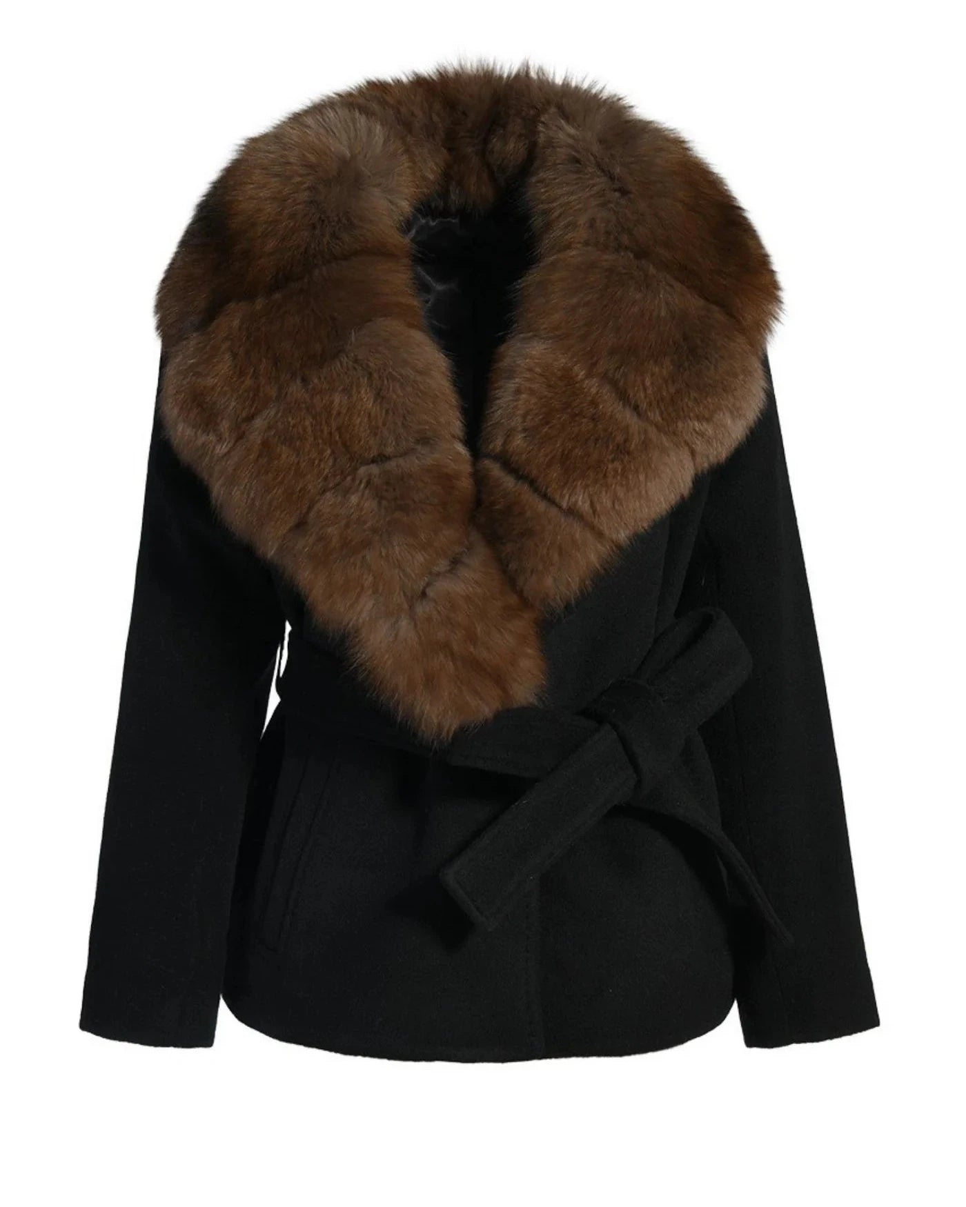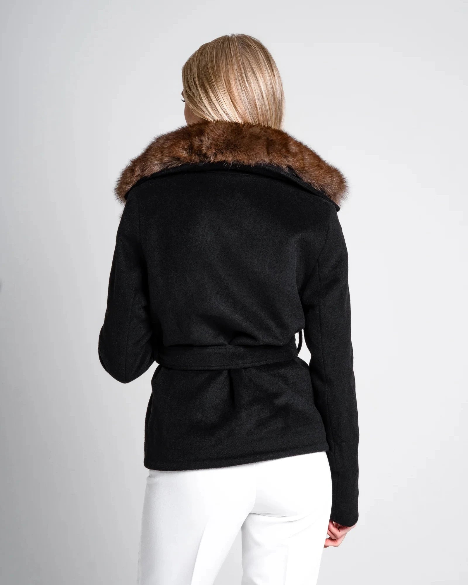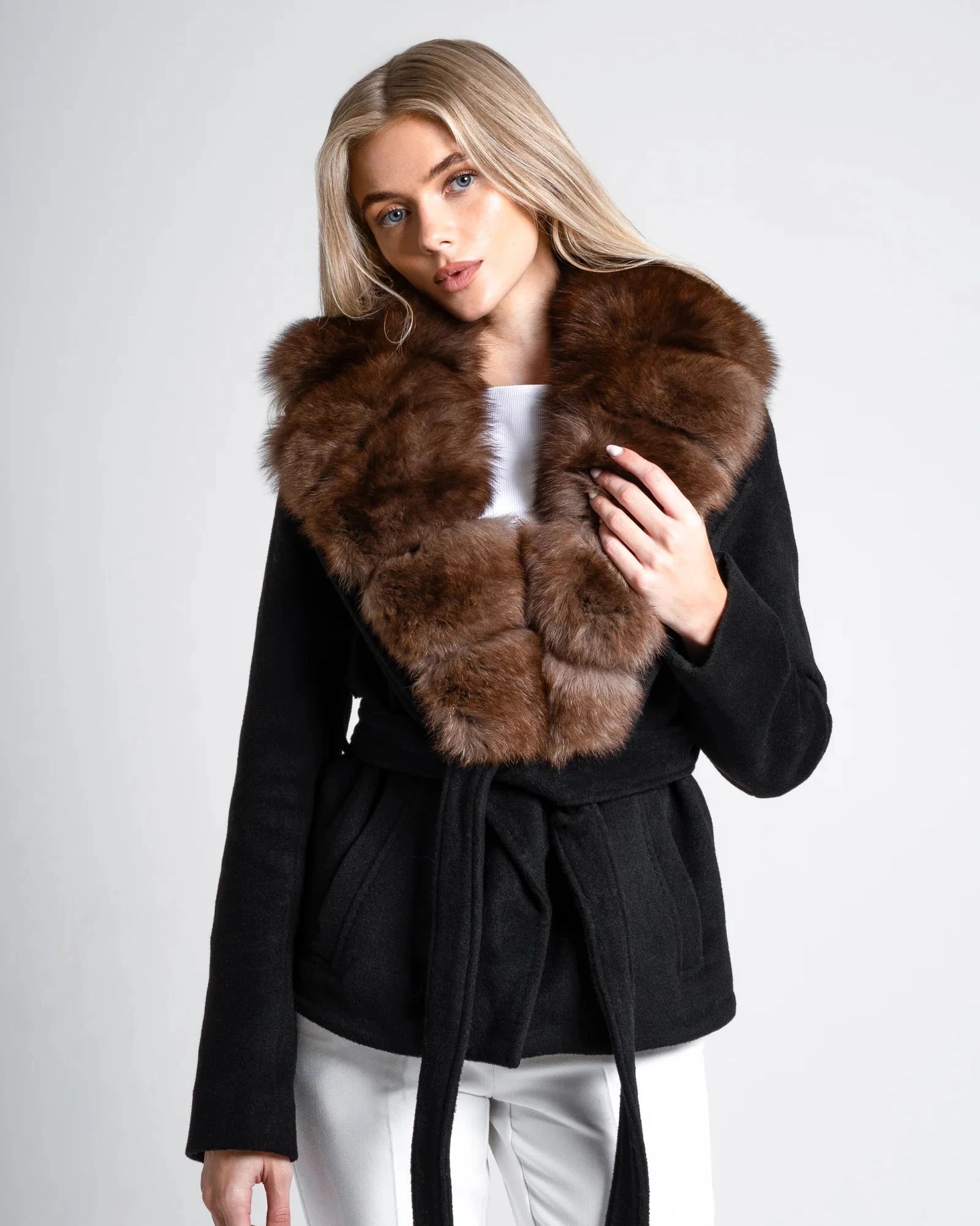 Ricco, profondo e innegabilmente raffinato, il cappotto Renesmie è caratterizzato da un'elegante silhouette nera in contrasto con un collo rimovibile in pelliccia di volpe nei toni intensi del caffè espresso.